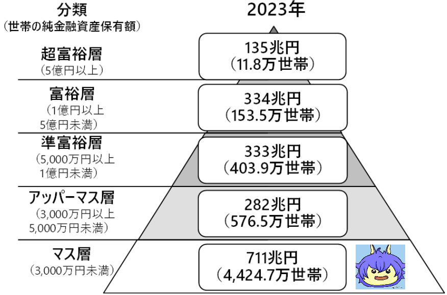 3000万円に行くとね、この純金融資産保有額の階層別にみた保有資産規模と世帯数の分類のアッパーマス層に近づけるかなって思ってね