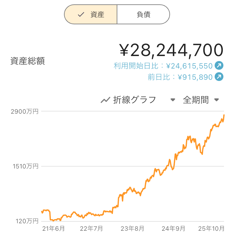 先日資産が2700万円になってたわーいと言っていたのですが、今朝マネフォを更新したらなんかぶっ飛んだ数字が出ました
