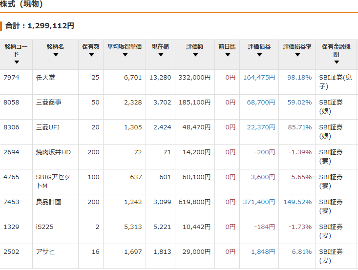 | 妻 | スポット | NISA成長 | 2502アサヒグループホールディングス㈱ iシェアーズ・コア日経225ETF1329東証 | 1,785 10,626 |