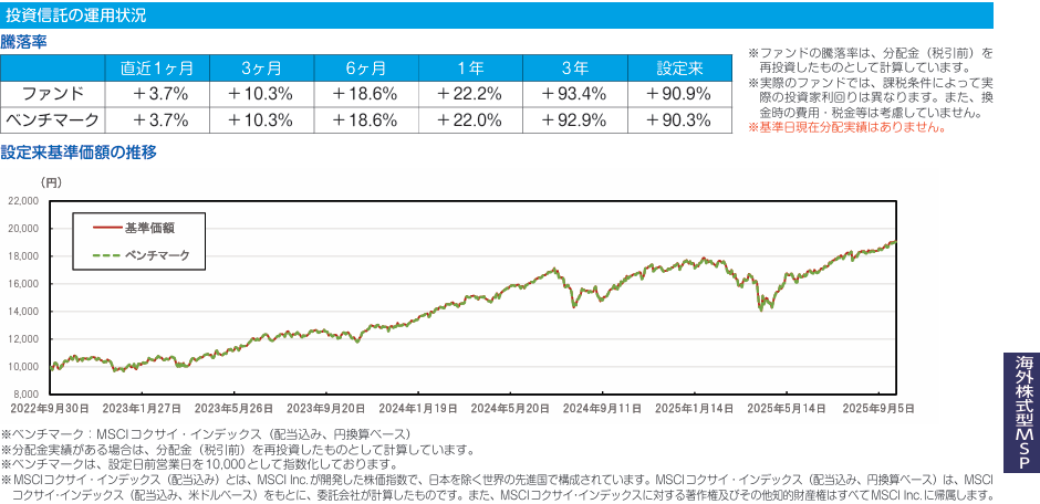 投資先は海外株式型MSPで、下記の通りMSCIコクサイ・インデックスとほぼ同じ運用結果ですので、ほぼ先進国株式です