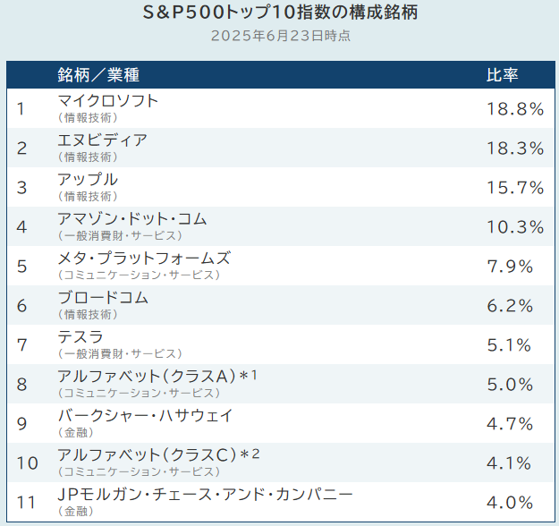 引用:S&P500トップ10指数の構成銘柄の見直し(2025年6月20日実施)|アモーヴァ・アセットマネジメント(旧:日興アセット)
