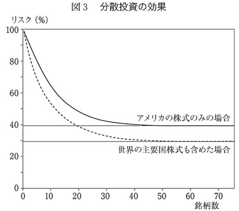 10銘柄に分散すればリスクが60~70%程度に(米国株~世界株)