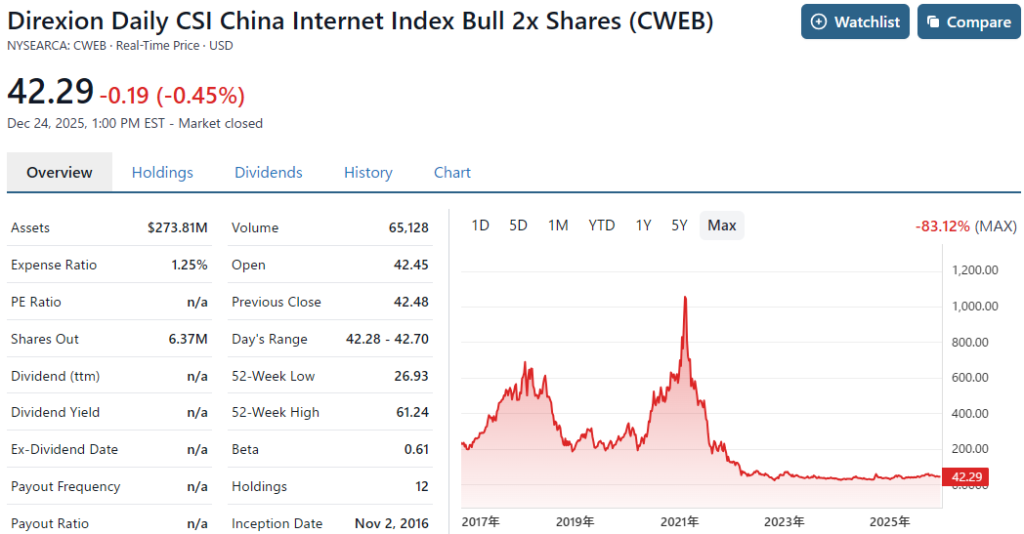 2021年にSOXLやTQQQと等に、当時とっても流行ったCWEBという中国インターネット関連企業2倍ブルETFの無残な今を置いておきますね…