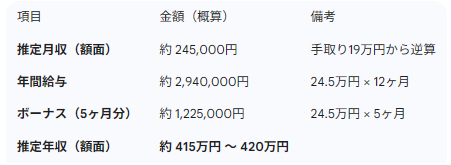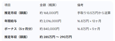 新卒の頃は手取り135,000円くらいだったと記憶しているので、そして夏冬期末賞与が合計5ヶ月くらいだったので、それをGeminiに伝えたら当時の社会保険料などなどを加味して計算してくれました